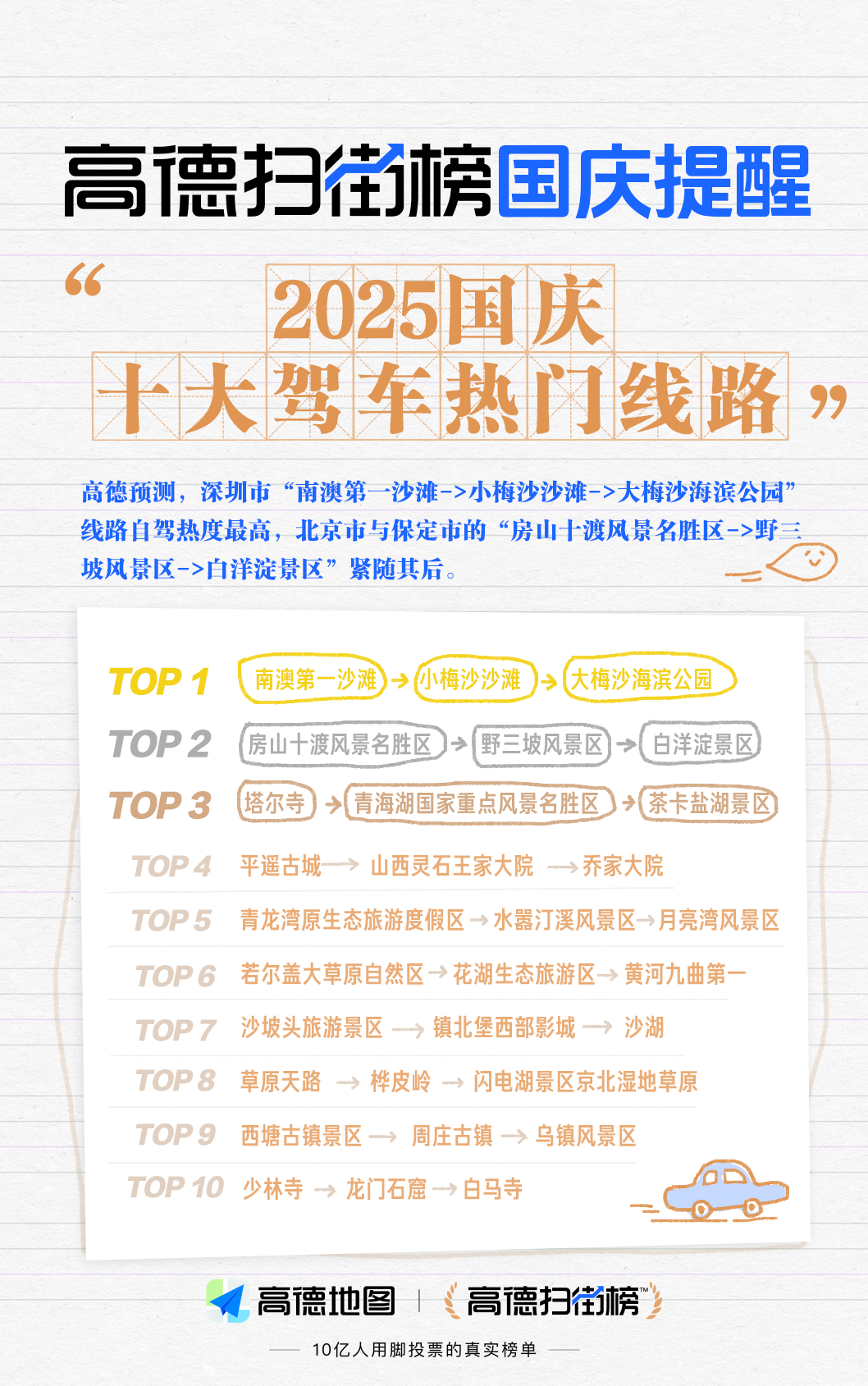 今天,2025年国庆假期全国驾车游热门路线TOP10也正式出炉。深圳市“南澳第一沙滩—小梅沙沙滩—大梅沙海滨公园”路线位居榜首;北京市与保定市的“房山十渡风景名胜区—野三坡风景区—白洋淀景区”排名第二。