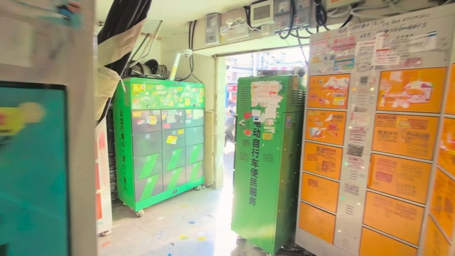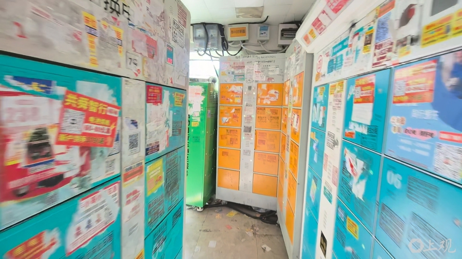 记者走进专放换电柜的门面房。房间不大,目测两米多宽,五米左右长,换电柜贴着墙摆放得满满当当,中间区域也紧密地堆了两列换电柜,整个房间仅留出一圈不到一米宽的通道,供人通行和操作换电。除了内部,房间外墙边,紧贴着墙处也放了5台换电柜。这些柜机品牌繁杂,涉及小哈、中国铁塔、国动换电等10多个品牌,共29台换电柜。五颜六色的柜机上,杂乱无章地贴着“膏药”式广告,变得面目全非,广告里有的是专门针对骑手的小额贷款广告,有的是床位出租,还有些是不良网址。门框上则挂满了电表箱,表明这里用电量极高。
