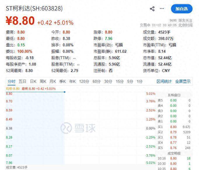 1月12日,ST柯利达复牌后“一字”涨停,公司股价上涨5.01%,至8.8元/股。